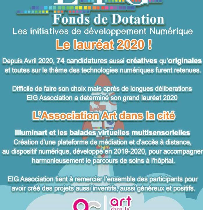 Des arts visuels aux arts numériques, depuis 18 ans, l’association Art dans la Cité introduit l’art dans les hôpitaux, dans le monde entier, avec le concours d’artistes émergents et de renommée internationale. Son ambition est de contribuer au mieux-être du patient, d’accompagner et d’améliorer son accueil et son séjour, ainsi que les conditions de travail du personnel, grâce à la création collective d’oeuvres installées durablement dans les espaces d’accueil et de vie de l’hôpital.